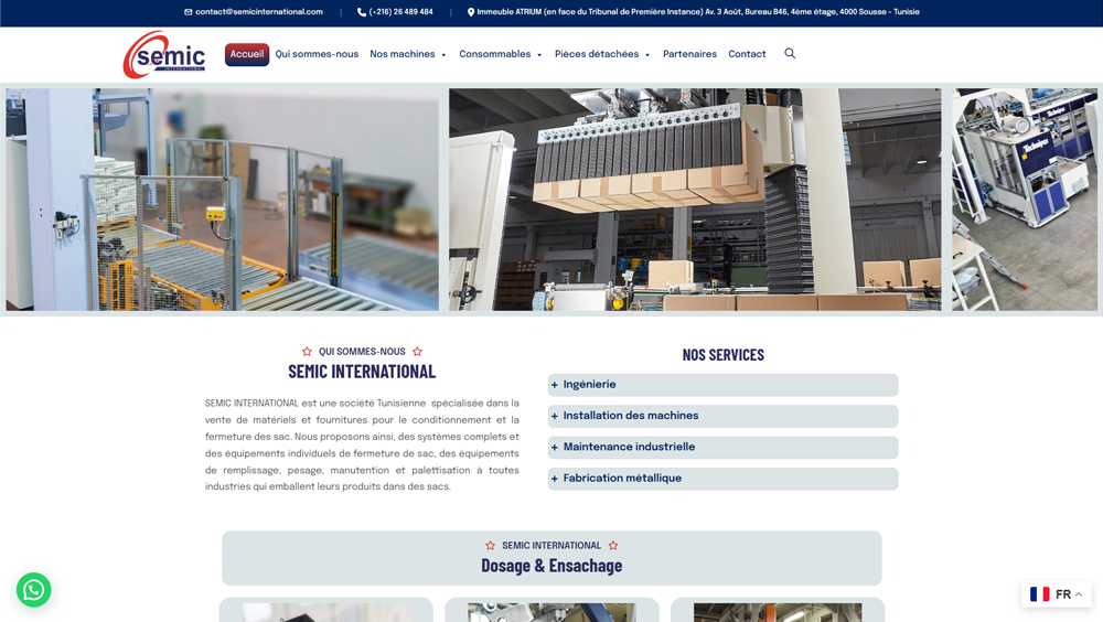SEMIC INTERNATIONAL est une société Tunisienne  spécialisée dans la vente de matériels et fournitures pour le conditionnement et la fermeture des sac. Nous proposons ainsi, des systèmes complets et des équipements individuels de fermeture de sac, des équipements de remplissage, pesage, manutention et palettisation à toutes industries qui emballent leurs produits dans des sacs.